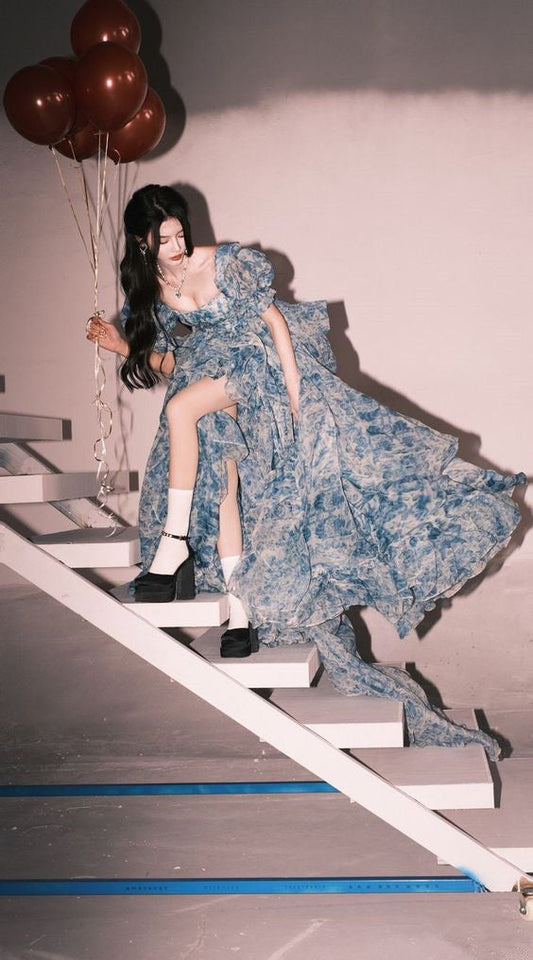 Elegant High Low Blue Floral Prom Dresses Long Formal Dress P1114