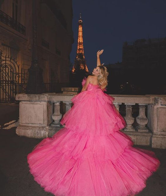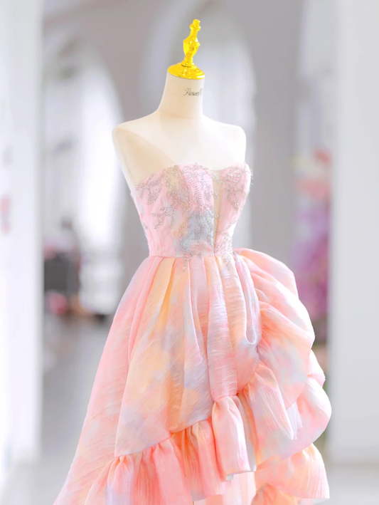 Sexy High Low Pink Tulle Strapless Long Prom Dress P966
