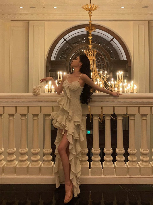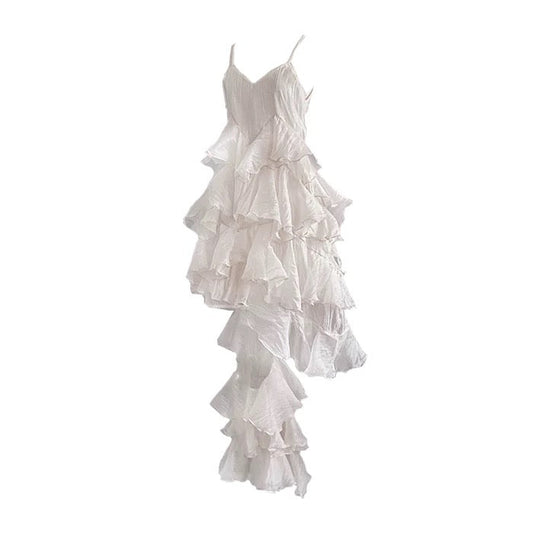 Sexy High Low Spaghetti Straps White Chiffon Ruffles Prom Dresses Birthday Outfits Evening Gown SD987