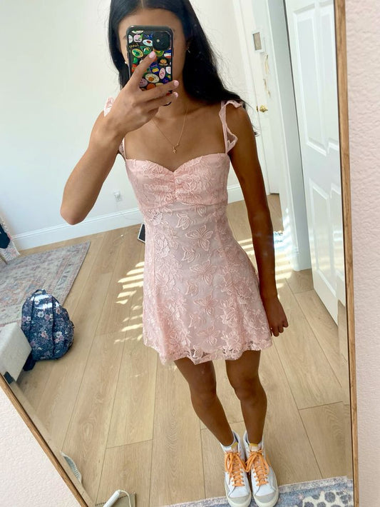 Pretty A Line Spaghetti Straps Blush Pink Lace Grad Dress Inspo Short Mini Formal 8th Grade Homecoming Dresses High School Hoco Court Dress Graduation Dress Cocktail Birthday Outfits DH1926