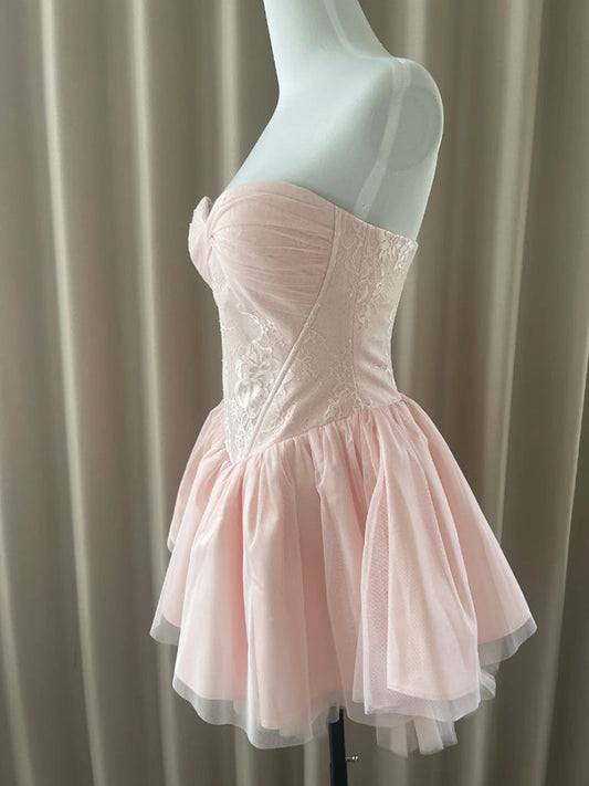 Pretty Ball Gown Strapless Pink Tulle Lace Formal 8th Grade Short Mini Homecoming Dress Summer Middle School Hoco Dresses Birthday Outfits W1161