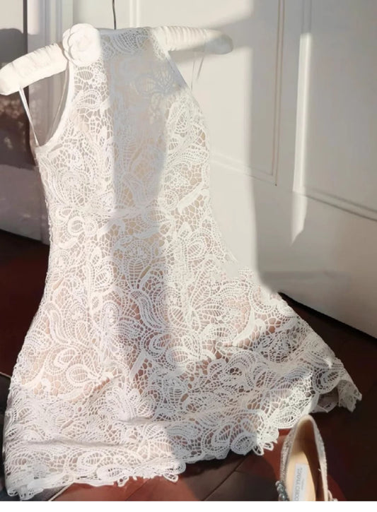 Pretty A Line High Neck White Lace Short Summer Homecoming Dress Hoco Dress Birthday Outfit 21st Birthday Mini Party Dresses DH417