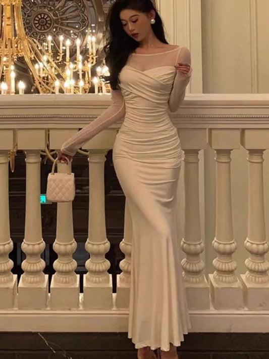 Mermaid Dress Women Patchwork Long Sleeves Vintage Solid Evening Party Gown fg5313