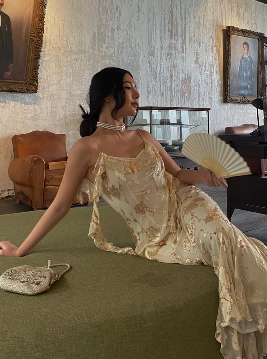 Vintage Mermaid Spaghetti Straps Gold Lace 1950s Retro Classy Satin Long Prom Dresses Party Dress 21st Birthday Outfits Graduation Dresses W875