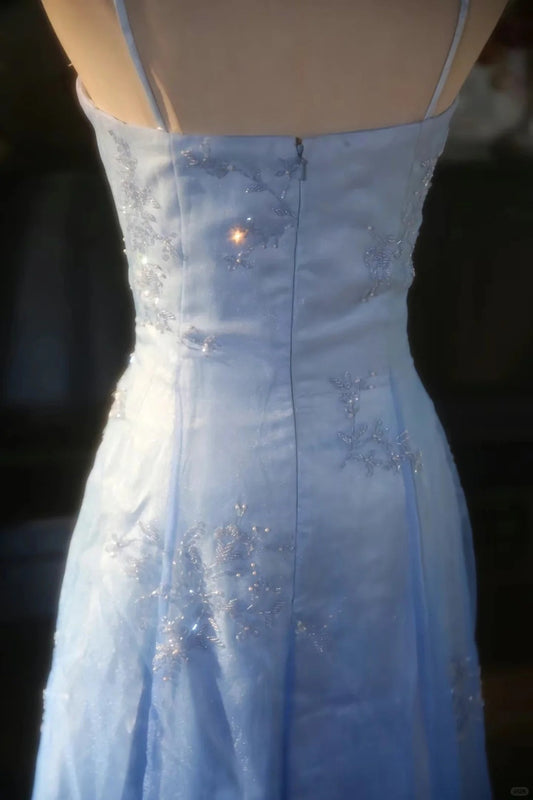 Vintage Lake Blue Design Neckline Beaded Satin Prom Dress P3763