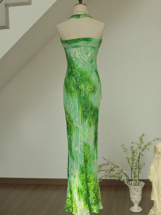 Unique Sheath Halter Green Print Floral Chiffon Open Back Long Prom Dress Formal Dress SH3866