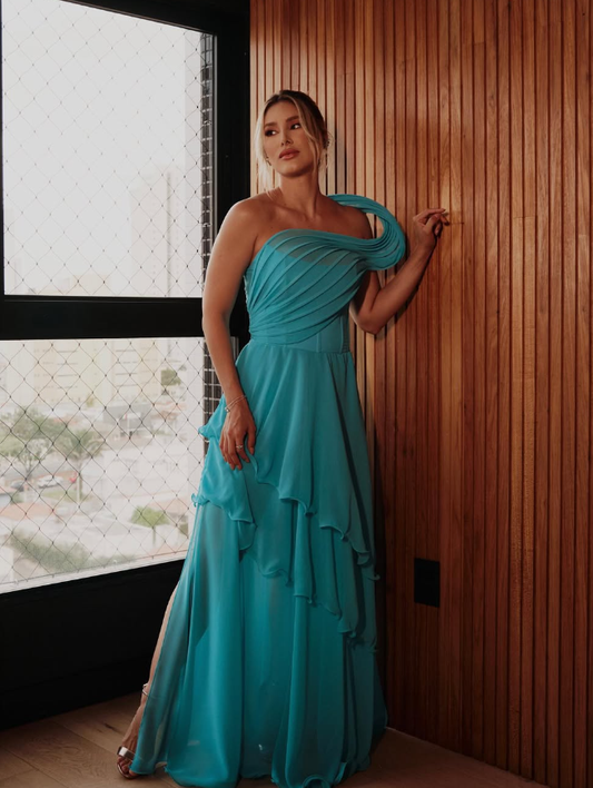 Unique A Line One Shoulder Blue Chiffon Long Prom Dress Evening Dress SH2504