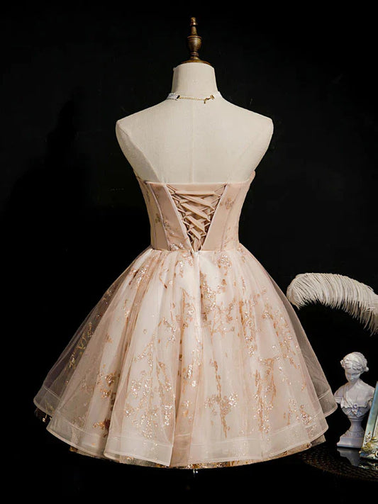 Strapless Champagne Beaded Tulle Short Prom Dress Homecoming Dress SH1698