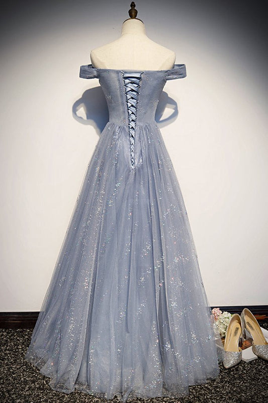 Strapless Blue Tulle Beaded Long A Line Off Shoulder Prom Dress, Evening Dress KS7423