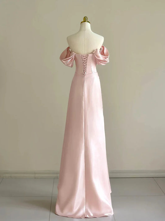 Pink A-Line Off Shoulder Satin Long Prom Dress, Beautiful A-Line Off the Shoulder Party Dress ED0994