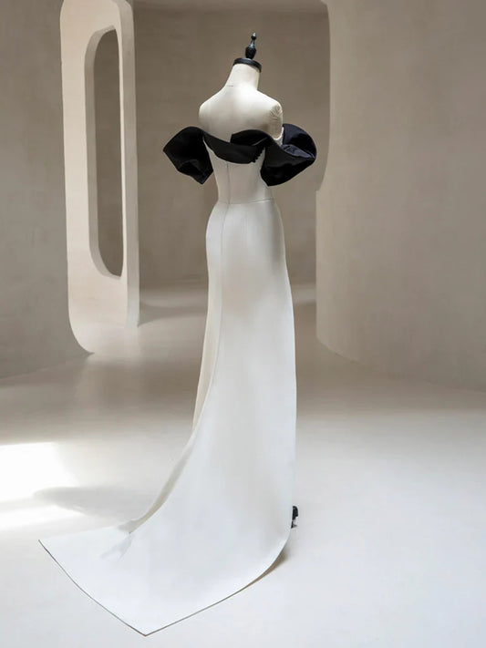 Simple Off Shoulder Satin Black/Beige Long Prom Dress, Black/Beige Long Formal Dress ED0752