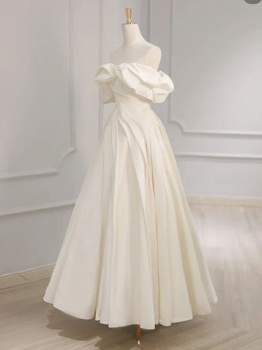 Off Shoulder A-Line Satin Beige Long Prom Dress, Beige Long Formal Dress ED055
