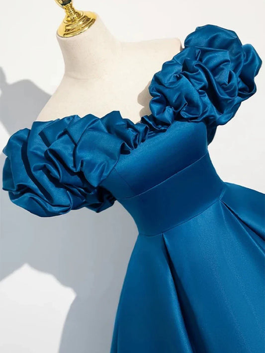 A-Line Off Shoulder Satin Blue Long Prom Dress, Blue Long Evening Dress ED0590