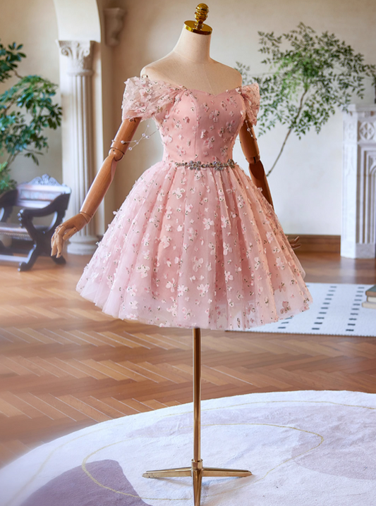 A-Line Off Shoulder Tulle Lace Pink Short Prom Dress, Pink Homecoming Dress ED023