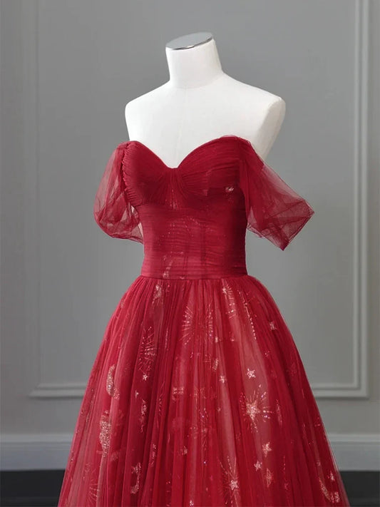 A-Line Off Shoulder Tulle Burgundy Long Prom Dress, Burgundy Long Formal Dress ED051