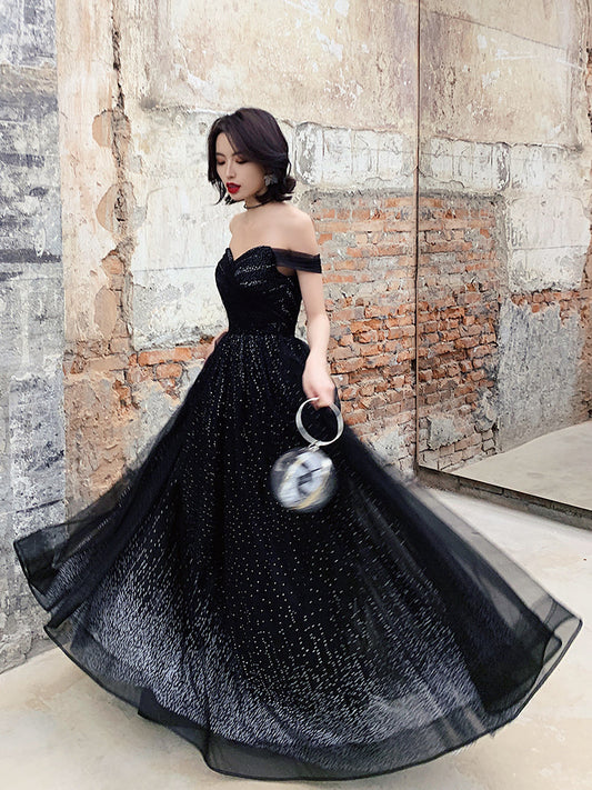 Black tulle sequins long prom dress, off shoulder evening dress 8080