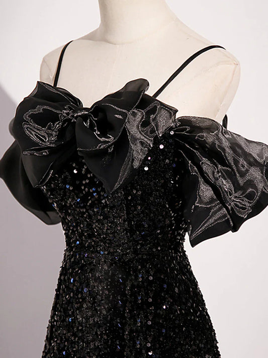 A-Line Off Shoulder Velvet Sequin Long Black Prom Dress, Black Long Evening Dress ED0707