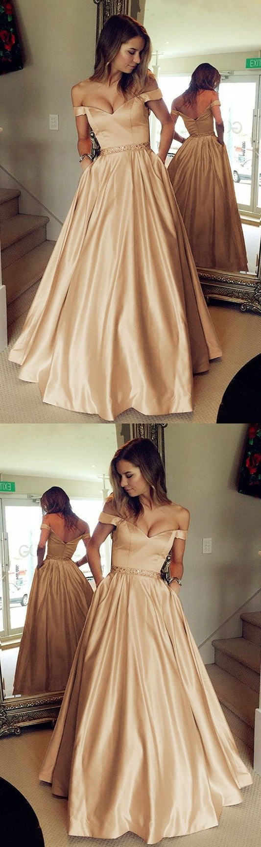 Champagne Satin Off Shoulder Beaded Sashes Satin Prom Dresses cg4619