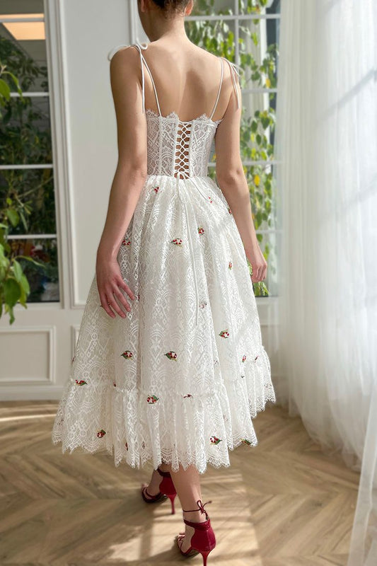 Spaghetti Straps Appliqued Sheer Lace A-Line Tea Length Evening Prom Dress fg4628