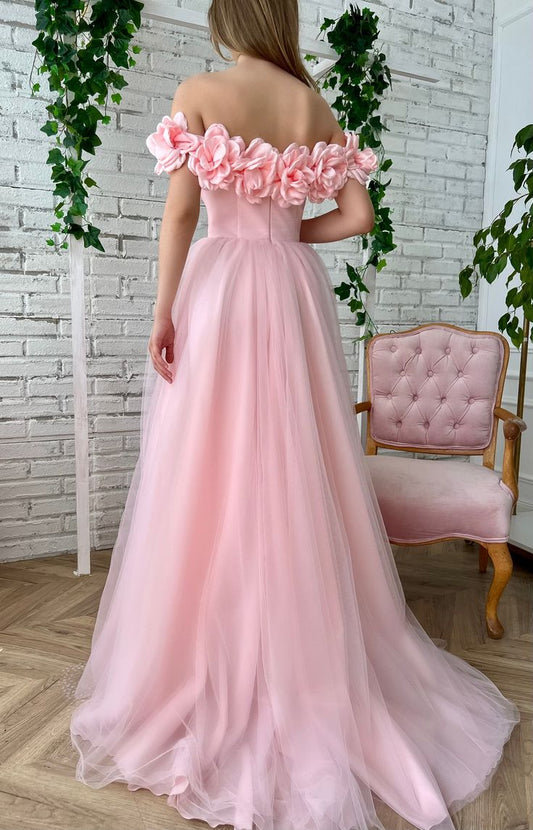 Pink Floral Prom Dresses, Off The Shoulder Evening Gown, Tulle Long Prom Dress fg4679