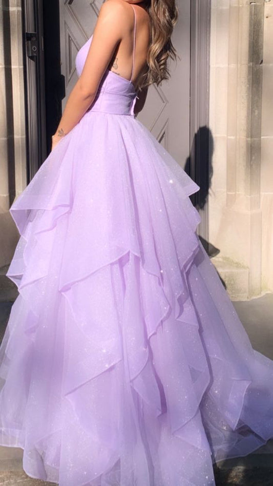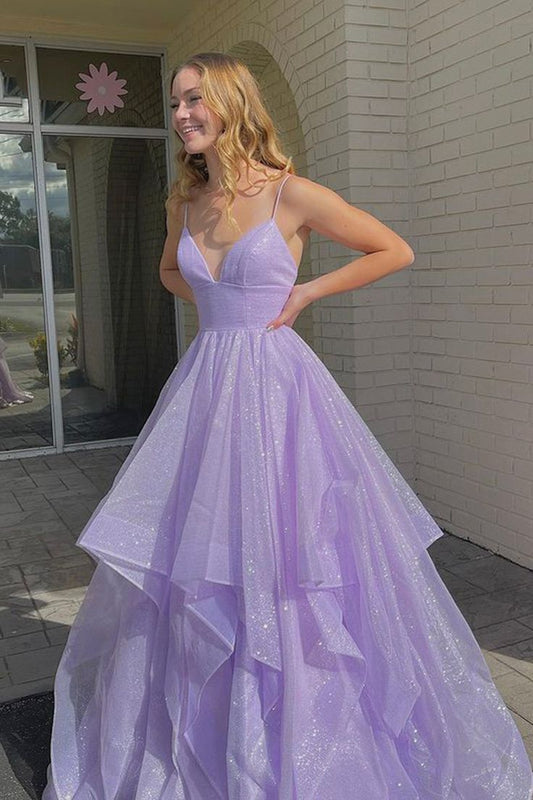 Purple V-Neck Tulle Long Prom Dresses, A-Line Party Evening Dresses fg4765