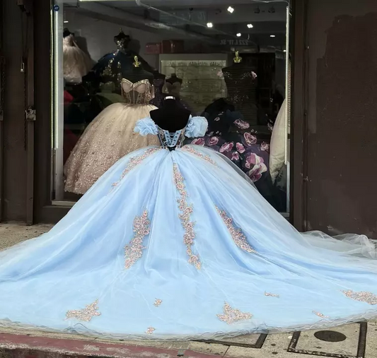 New Arrival Sky Blue Ball Gown Quinceanera Dresses Court Train Beading Lace Flowers Appliques Sweet 16 Prom Party Gowns fg5471