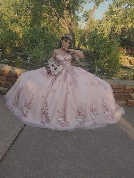 Pink Ball Gown Quinceanera Dress Applique Off the Shoulder Sweet 16 Vestidos fg5899
