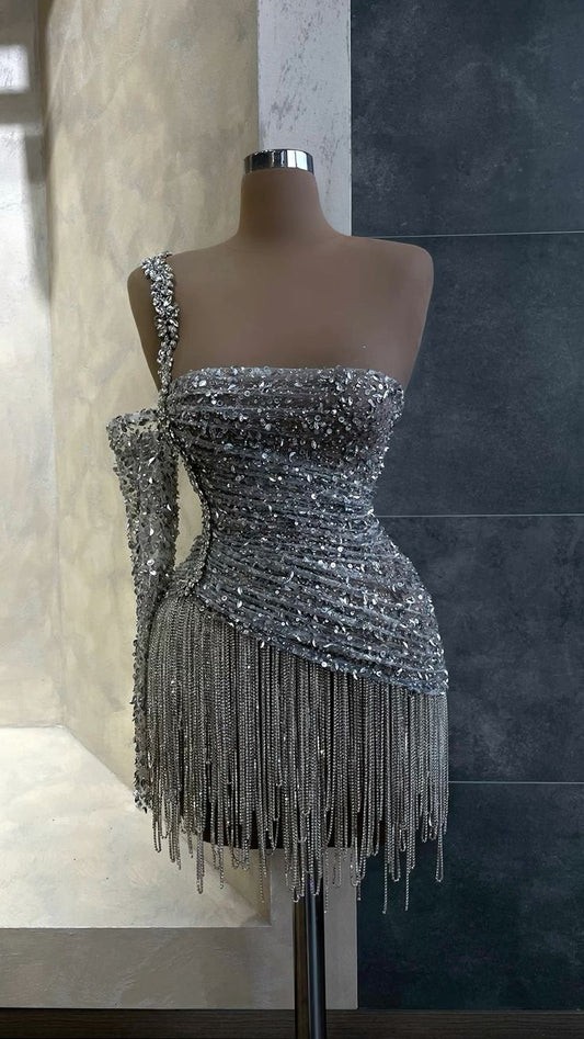 Silver Beaded Cocktail Dress With Long Tassel Fringes One Sleeve Crystal Sequin Sparkly Short Homecoming Wear fg6592