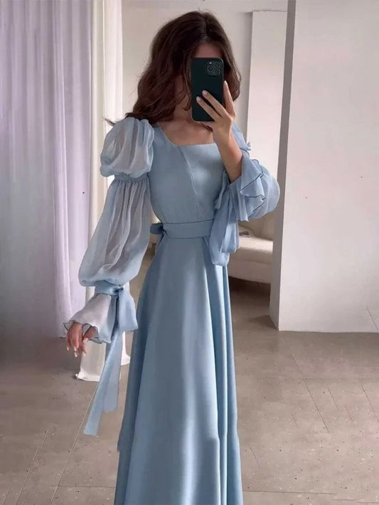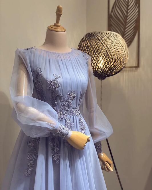 Light Blue Puff Sleeves Long Evening Dress fg6688