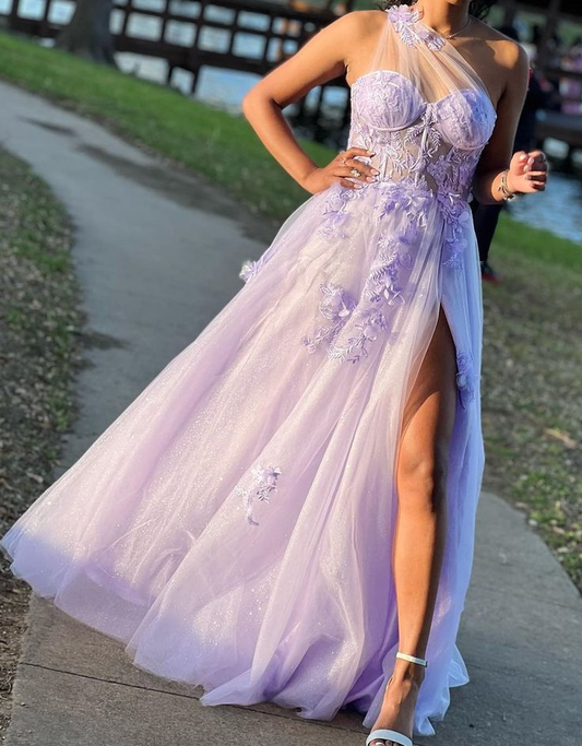 Dreamy Lavender Sheer Mesh One-Shoulder Long Prom Gown fg7292