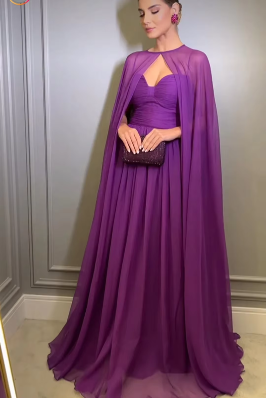Elegant Purple Chiffon Long Evening Dress with Cape A-Line Pleated Floor Length Formal Prom Gown fg7269