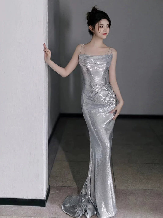 Silver Sequin Mermaid Long Prom Dress Sexy Evening Dresses fg7666