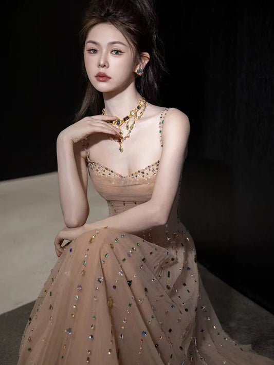 A Line Champagne Long Prom Dress Sexy Evening Dresses fg7663