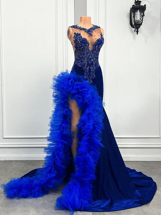 Royal Blue Mermaid Prom Dress Ruffled Evening Dresses with Slit fg7640