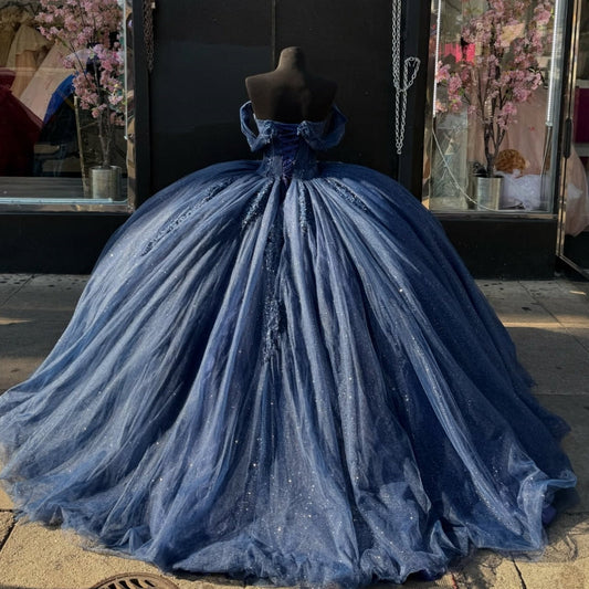 Sweet 16 Birthday Party Dresses Navy Blue Off-Shoulder Lace Appliqued Tulle Ball Gown for Birthday Celebration Sweet 15 Mexican Dresses fg6897