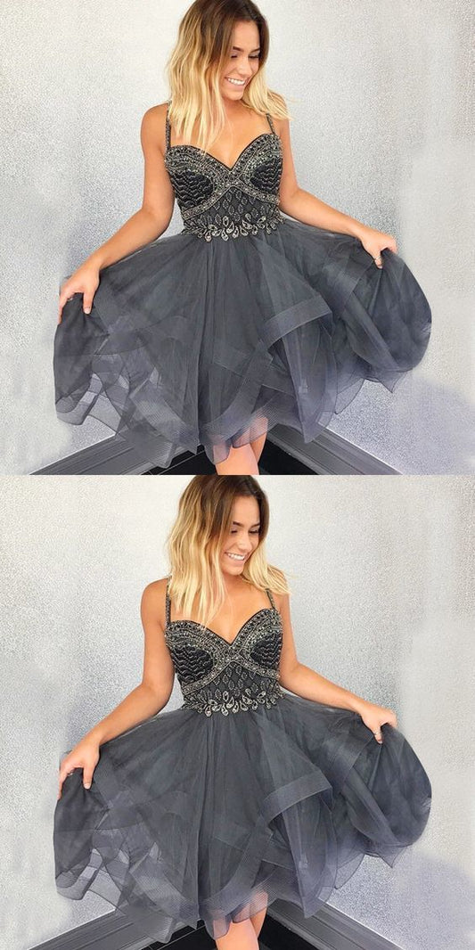 Charming Sliver Grey Short Beaded Tulle Party Dress homecoming Dress cg11394