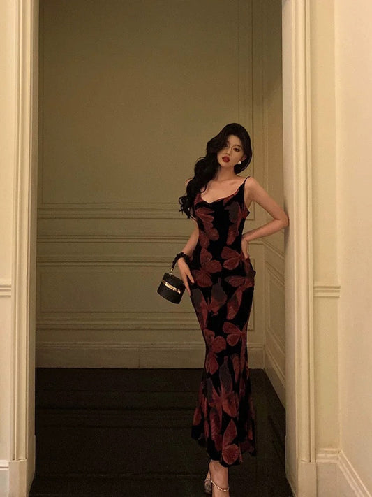 Gorgeous Mermaid Spaghetti Straps Pink Floral Date Night Dress Prom Dresses Birthday Outfits SD1093