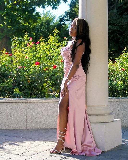 Elegant Sheath Sweetheart Pink Slit Satin Long Prom Dresses Party Dress Summer 20th Birthday Outfits 18th Birthday Dresses DH479