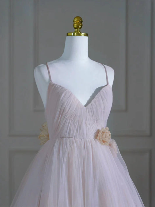 A-Line V Neck Tulle Pink Long Prom Dress, Pink Tulle Long Formal Dress ED020