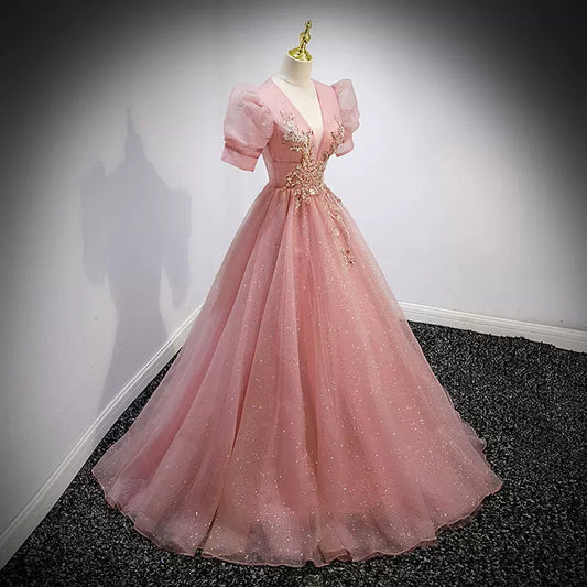Ball Gown Short Sleeves Long Tulle Pink Prom Dresses SH034