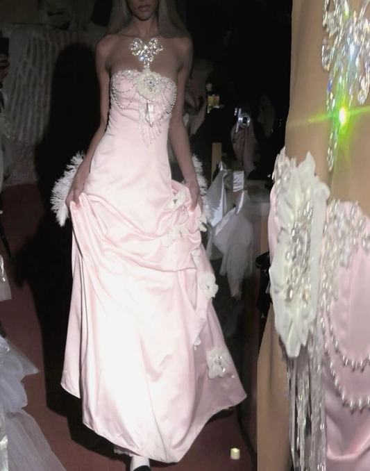 Pink Strapless Satin Long Prom Dresses Evening Dress With Flowers fg7076