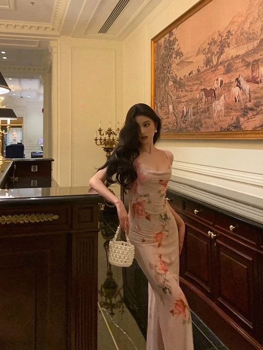 Sexy Sheath Spaghetti Straps Floral Pink Ankle Length Prom Dresses Birthday Outfits SD597