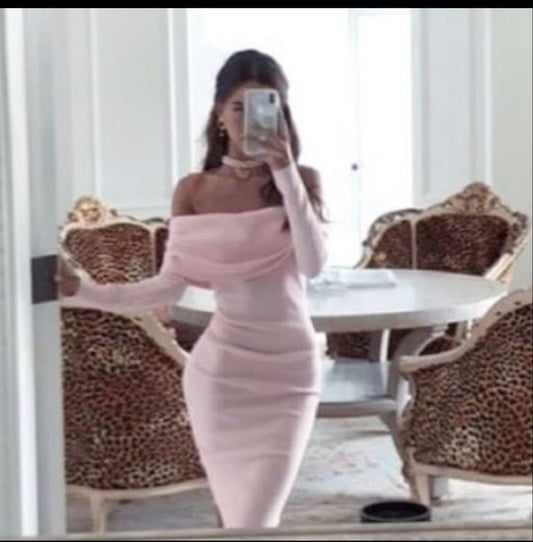 Pretty Sheath Off The Shoulder Pink Long Sleeves Prom Dresses Formal Evening Dress SD1411