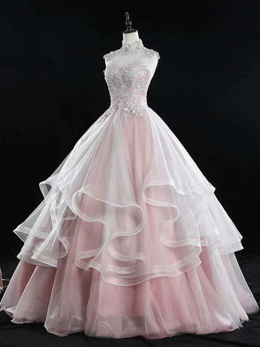 Pink A Line Tulle Lace Long Prom Dress, Pink Sweet 16 Dress ED0839