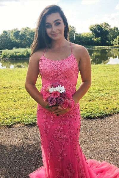 Modern Pink Long Spaghetti Straps Mermaid Prom Dress With Lace fg3186
