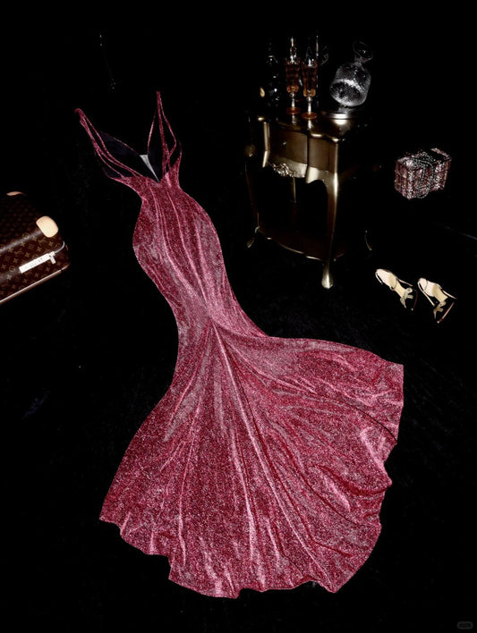 __urgundy backless fishtail skirt walking galaxy long ball gown evening dress prom dress gh4332