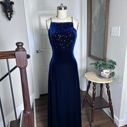 Dark Blue Vintage 90s Velvet Boat Neck Beaded Gown Long Prom Dress Evening Gown Party Dress gh4342