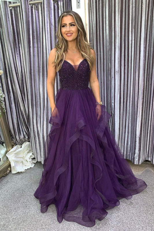 PURPLE TULLE LONG A LINE PROM DRESS WITH BEADS cg22643