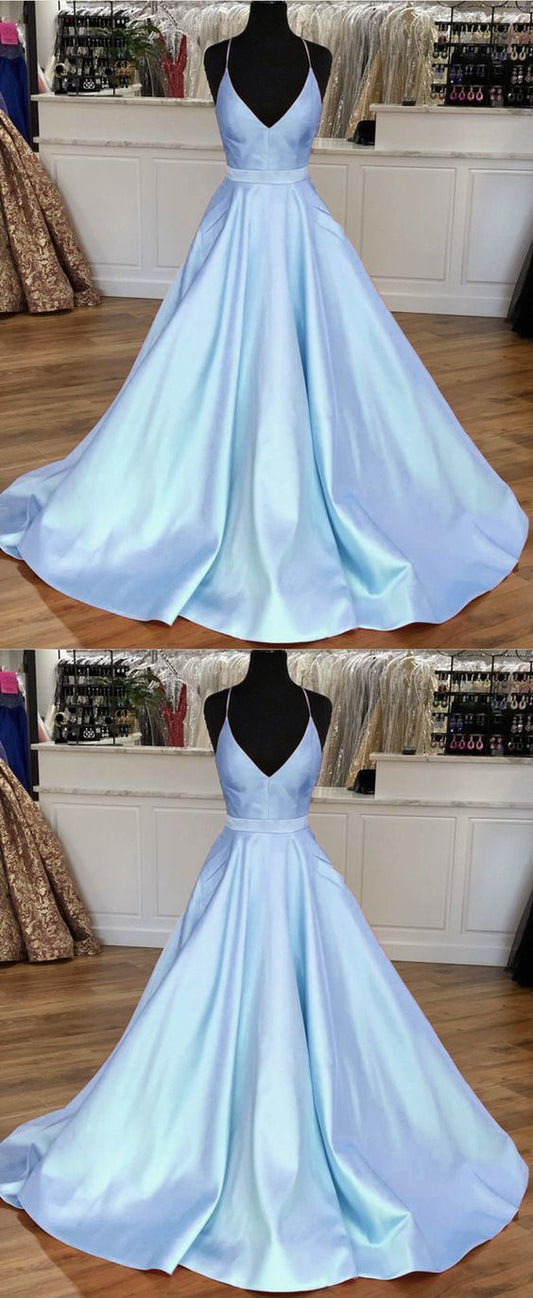 Light Blue Satin V-neck Cross Back Prom Dresses cg5221