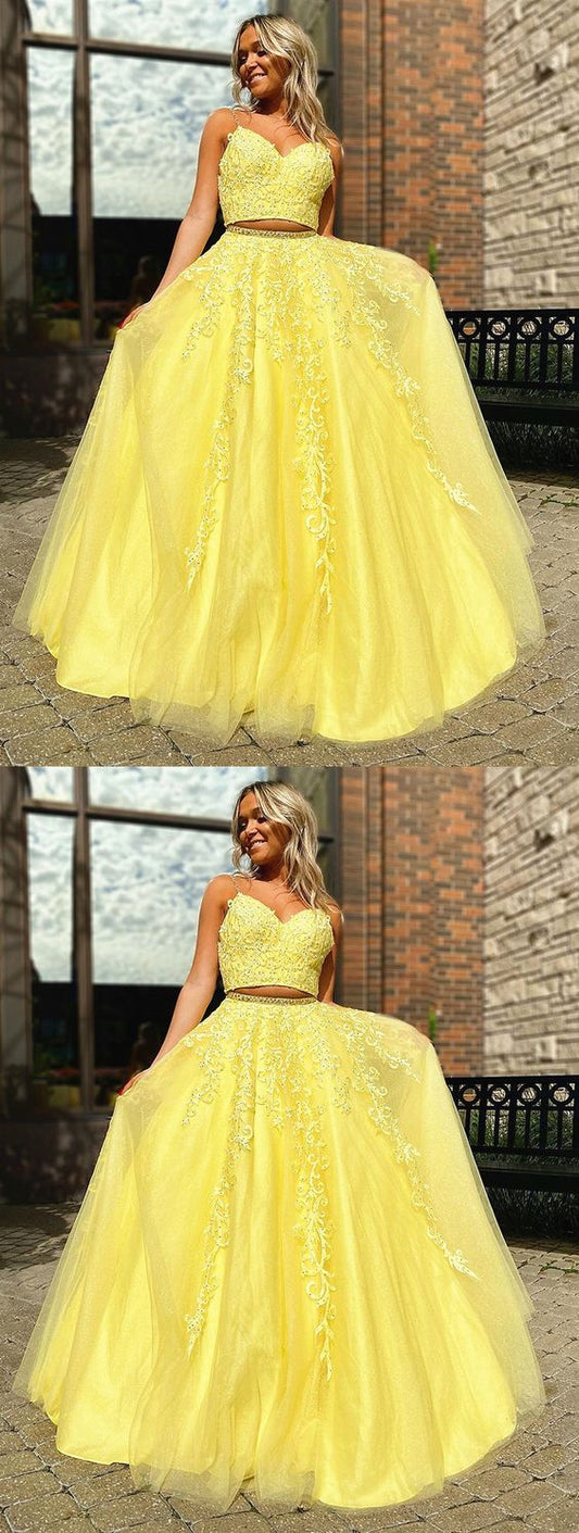 A Line V Neck 2 Pieces Yellow Lace Prom Dresses, Two Pieces Yellow Lace Formal Evening Dresses cg5860